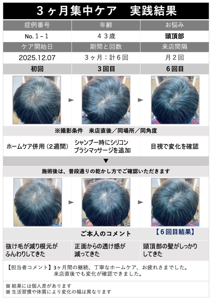 【実践結果#001-1】43歳/男性/つむじ(頭頂部) 2026 3/01 M字・生え際(同一人物)の変化を見る▶︎ 予約・問い合わせ 公式LINE予約・相談 Google Mapを開く メンズヘッドスパ メンズヘッドスパ 育毛スパ