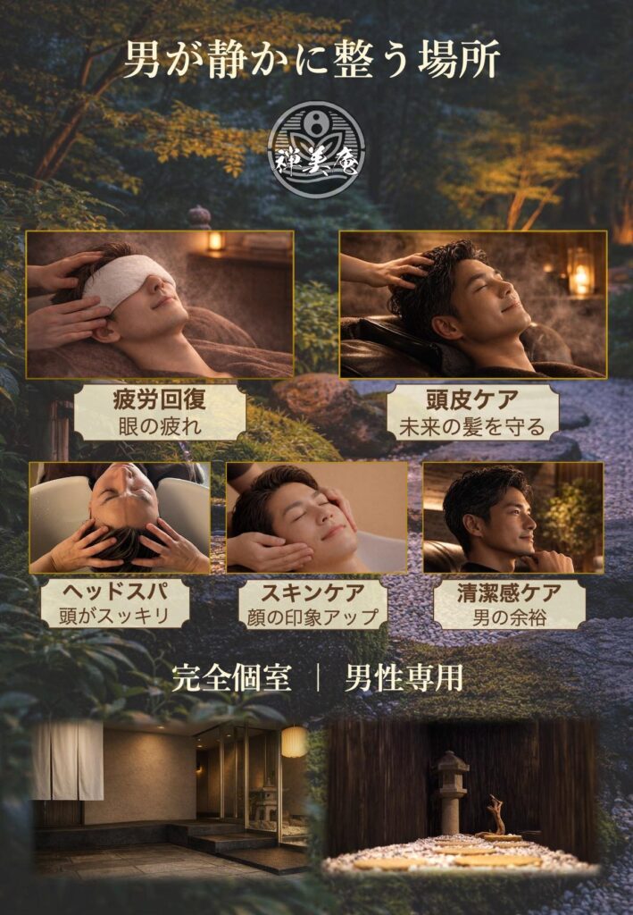 禅美庵は、頭皮と肌を同時に整える、男性専用の個室ケアサロンです。